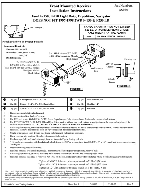 Draw-Tite Front Mount Receivers are built according to manufacturer vehicle specifications and model year to ensure a perfect fit and top towing performance. Featuring solid all-welded construction for maximum strength and safety, every hitch meets and exceeds industry standards. 2" Square Receiver Tube Opening Offers a secure and useful attachment pointNeat Appearance, All Frame Attachments E-Coat Base w/ Black Powder Coat Finish Rated up to 9,000 lbs. Line PullRated up to 500 lbs. Tongue Weight Solid All-Welded Construction for Maximum Strength and Safety Custom Built According to Manufacturer & Model Year Computer-Aided Design and Fatigue Stress Testing Designed to Withstand Road Abuse Within Specified Capacities Backed by a Nationwide Limited Lifetime Warranty